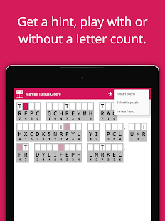 Advanced play features include letter frequencies, multi-level undo and hints. Three difficulty levels will challenge beginners and seasoned players alike, Share the results with your puzzling friends with a single tap via email, Facebook or Twitter.