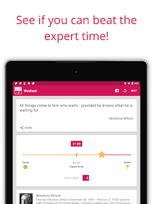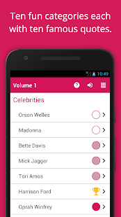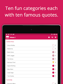 The one hundred hand-picked cryptogram puzzles are organized into ten popular categories like Ancient Wisdom, Celebrities, Comedy, Philosophy, Politicians and Sports. When you finish the puzzle, you'll see how your time compares to expert cryptogram puzzlers and the number of hints taken if any. There is also a short description of the author and a link to find more information.
