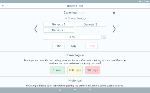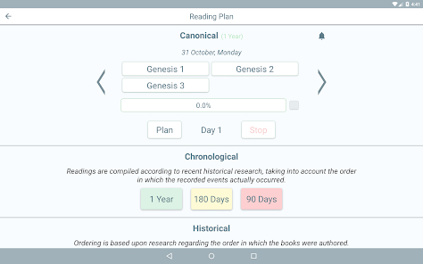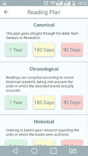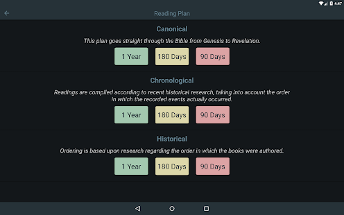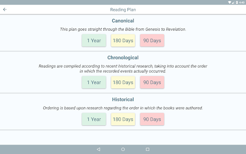 Chronological, Canonical and Historical reading plans for one Year, 180 and 90 Days.