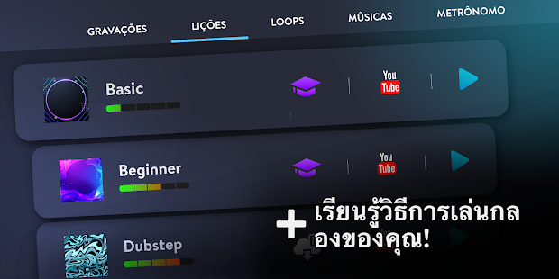 Real Drum มีบทเรียนวิดีโอหลากหลายเพื่อช่วยคุณ พร้อมกับ loop ต่าง ๆ สำหรับการเล่นตาม