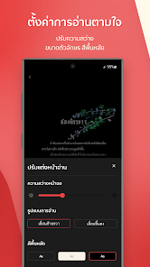 • ตั้งค่าการอ่านดั่งตาฝัน ปรับความสว่าง ขนาดตัวอักษร สีพื้นหลัง ปัดซ้ายขวา บนล่าง ตามใจถนัด