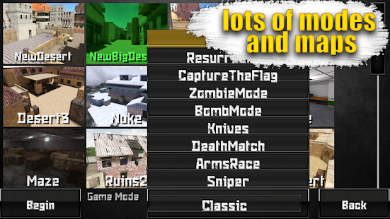 9 game mode (Classic,Resurrection,Capture the Flag,Zombie Mode,BombMode,Knives,Deathmatch,ArmsRace,Sniper)