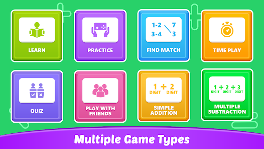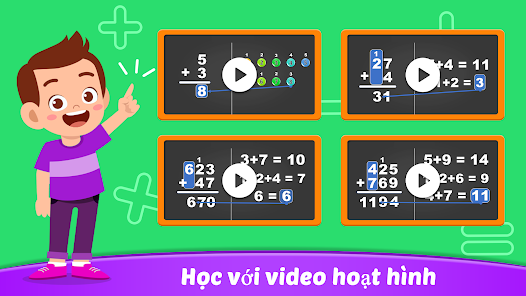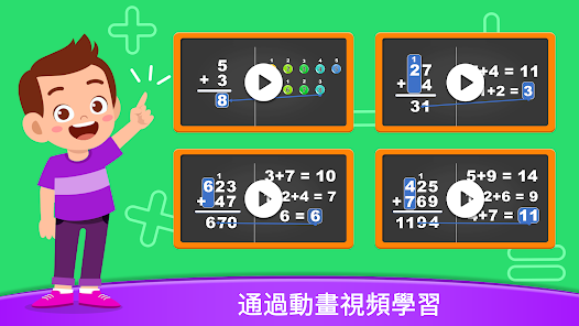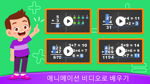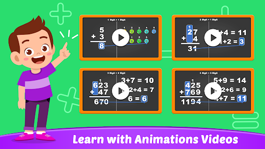 เกมเรียนรู้การบวกและการลบนำเสนอวิดีโอแอนิเมชั่นสำหรับเด็กเพื่อเรียนรู้โดยการดูและเกมที่น่าสนใจอื่น ๆ เช่น เกมการบวกและการลบเลขหลักเดียวและหลายหลัก เกมเล่นเวลา และเล่นเกมกับเพื่อน