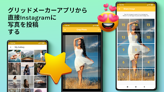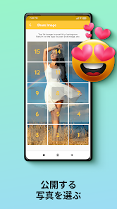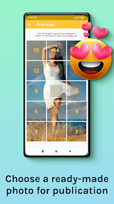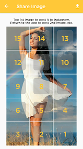 Choose a new picture from photo gallery and choose a suitable sizing option among the 5 available options, and let 15 Square Grid Maker crop the image for you! All you have to do is to submit the resulting pics to your Instagram in the order suggested by the app. You don't even have to save the tiles to your device as sharing to 15 Square Grid Maker is embedded in the application!