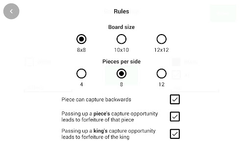 You can choose the size of the board, either 8x8, 10x10 or 12x12. Depending on your preferences, you can also choose the number of pieces on the board and other rules which can be found in the game rules section.