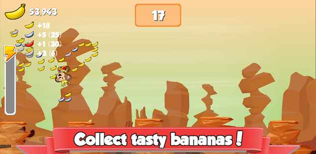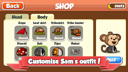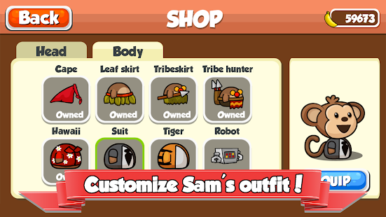 วิ่งกระโดดและแกว่งจากเสาเสาหลักที่จะช่วยให้แซมอยู่รอดนรกและเพิ่มคะแนนของคุณ แมงดาเจ้าคณะของคุณโดยการเก็บรวบรวมกล้วยเพื่อปลดล็อครายการใหม่ ๆ เช่นหัวและลำตัวเครื่องประดับและซื้อในเกม ups พลังงาน เมื่อคุณกดกอริลลาระทึกขวัญของคะแนนคุณสามารถแลกเปลี่ยนกับกล้วยและปลดล็อคแผนที่