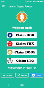 Lemon Crypto Faucet เป็นแอปพลิเคชั่นรางวัล Crypto โดยใช้แอพนี้ผู้ใช้สามารถรับ Dogecoin, Litecoin DGBcoin และ Troncoin ฟรี ในการพัฒนาแอพนี้ เราใช้คุณสมบัติการดูเว็บ เรามีเว็บไซต์โดเมนและโฮสติ้งของเราเอง เราซื้อโดเมนพรีเมียมและโฮสต์เพื่อพัฒนาแอพนี้