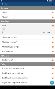 แอปคู่มือคำศัพท์ประกอบด้วยข้อความและคำศัพท์ที่ใช้เป็นประจำมากกว่า 800 รายการ คุณสามารถใช้ประโยชน์จากข้อความเหล่านี้ในการเดินทางไปต่างประเทศ พบปะกับเพื่อนชาวต่างชาติ รับมือกับเหตุการณ์ฉุกเฉิน และอีกมากมาย
