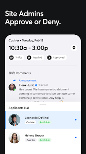 Review and approve or deny shift swap applications between team members, and for manager posted shifts. Manage multiple applications all on one shift card.