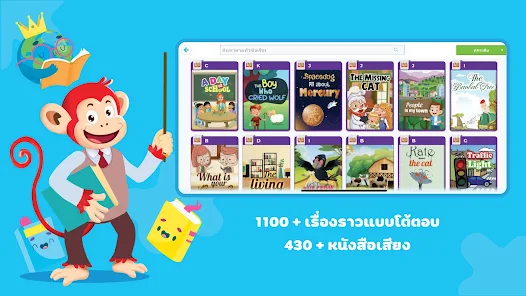 หนังสือเสียงมากกว่า 430 เล่มใน Monkey Stories แบ่งออกเป็น 4 ระดับ มีหัวข้อที่หลากหลายด้วยเนื้อหาที่เหมาะสม
