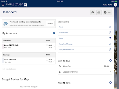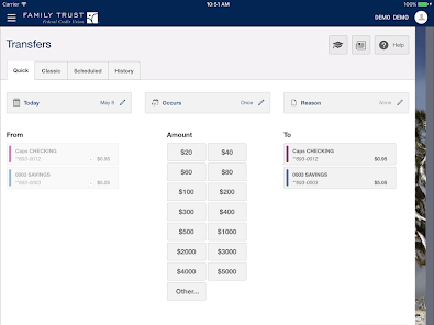The app allows you to transfer money between your Family Trust accounts and other financial institutions, make loan payments, find branches and surcharge-free ATMs, and deposit checks.