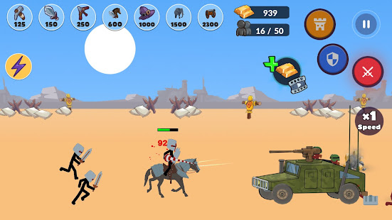 An exciting stickman battle awaits you. Siege new lands in different eras of the Middle Ages, Crusaders, Musketeers and ending with Cyberpunk and the Future. Immerse yourself in the heritage era of ancient and modern battles. Defend your base from an onslaught of enemy stickman troops. Siege the enemy tower and destroy it to win. Use unique tactics for each battle and location. Over 50 unique quests await you!