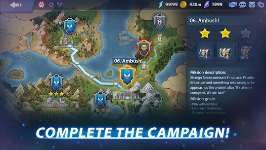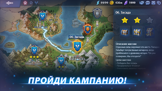 เลือกกลยุทธ์และกลยุทธ์ของคุณ เล่นและชนะการต่อสู้ครั้งยิ่งใหญ่ระหว่างพันธมิตรแห่งแสงสว่างและความมืด คนแคระและก็อบลิน ออร์คและมนุษย์ อันเดดและเอลฟ์ — แต่ละเผ่าพันธุ์มีลักษณะเฉพาะ! เวทมนตร์แห่งการรักษาของเอลฟ์ พิธีกรรมอันมืดมิดของเหล่าอันเดด ดาบที่ไว้ใจได้และเวทมนตร์ของมนุษย์ ความโกรธเกรี้ยวของออร์ค สิ่งประดิษฐ์ที่บ้าคลั่งของก็อบลิน และเทคโนโลยีอันยอดเยี่ยมของคนแคระ ใช้พวกมันอย่างชาญฉลาดเพื่อเอาชนะ
