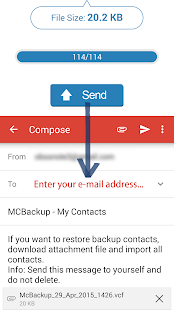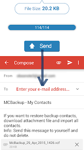 IMPORTANT NOTE: After sending backup file (*.vcf) to yourself, please check your inbox if message arrived and contains attachment (backup file). Sometimes email providers block attachments if attachment size is too large. Try with another mail account if possible, to send your backup file. Or copy backup file (on SD card) to your computer via USB cable.