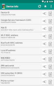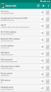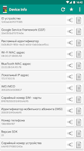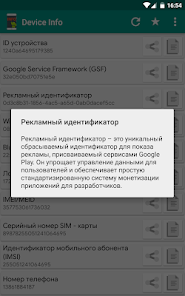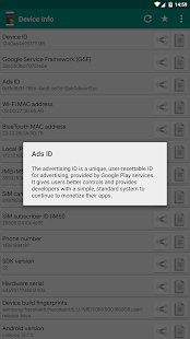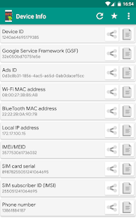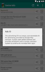 Simple Android application that will help you to get Android device info like Android Device ID, IMEI, Phone Number, Google Service Framework ID (GSF ID), Advertising ID (ads ID), Local IP Address, Hardware Serial, Display Info, SoC Info, etc., which you can copy or share for further using.