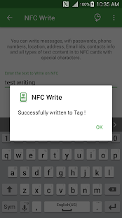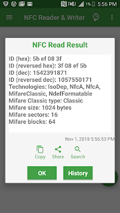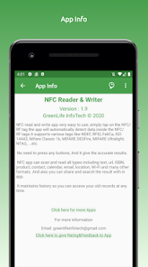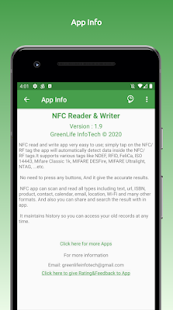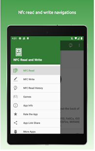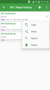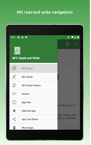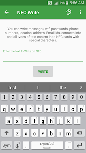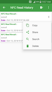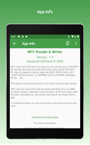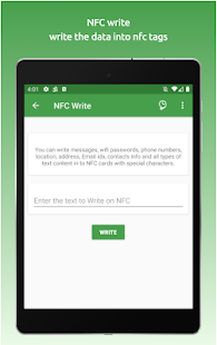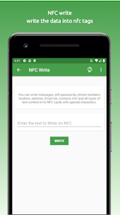 NFC app can write and read all types of data including text, url, ISBN, product, contact, calendar, email, location, and Wi-Fi credentials from all types of the NFC, RF cards. And also you can share and search the result with in app.