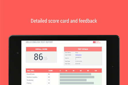 สวัสดีภาษาอังกฤษทดสอบการประเมินไม่จำเป็นต้องมีผู้สอบจะต้องมีโครงสร้างพื้นฐานพิเศษใด ๆ การทดสอบการทำงานทางด้านขวาบนมาร์ทโฟน Android ของพวกเขาเพื่อให้มั่นใจ scalability อันยิ่งใหญ่และความสะดวกในการใช้งาน การทดสอบจะมี proctored อย่างเต็มที่เพื่อให้มั่นใจว่ามีไม่โกง