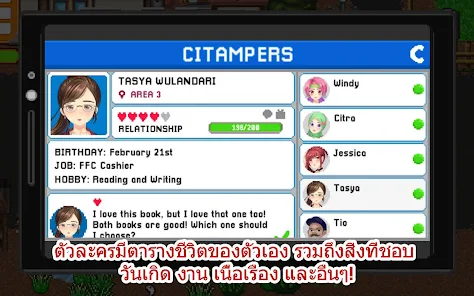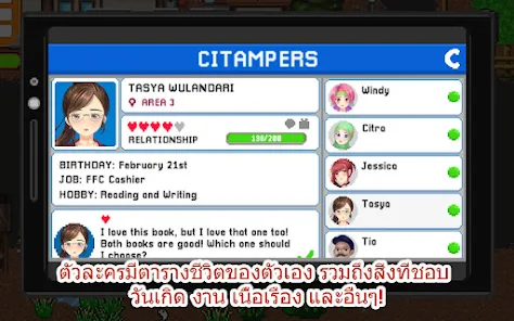 มีอะไรให้ทำเพียบ! ตัวละครทุกตัวในเกมเรื่องราวแห่ง Citampi มีเนื้อเรื่องที่เข้มข้นสุดๆ เพราะเราคิดและออกแบบเนื้อเรื่องและบุคลิกของตัวละครแต่ละตัวเป็นอย่างดี คุณจะเข้าใจเองเมื่อมีโอกาสได้ทำความรู้จักและช่วยงานพวกเขาในชีวิตประจำวัน