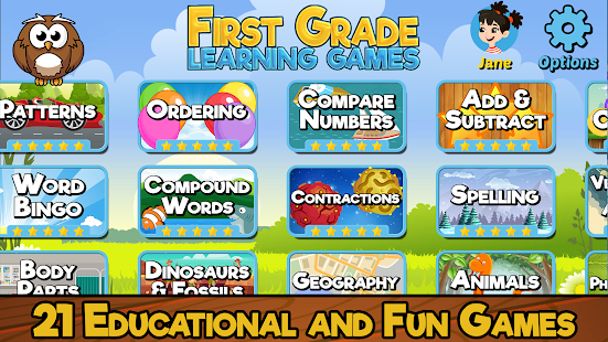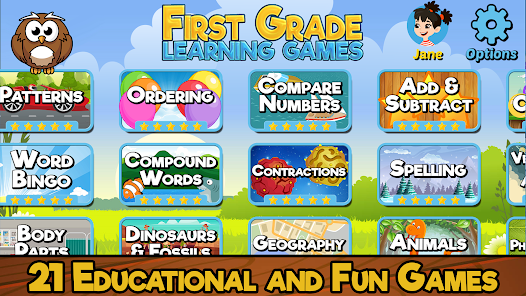 เกมทั้ง 21 เกมได้รับการออกแบบโดยใช้หลักสูตรชั้นประถมศึกษาปีที่ 1 จริงและใช้มาตรฐานของหลักสูตรแกนกลางดังนั้นคุณจึงมั่นใจได้ว่าเกมเหล่านี้จะช่วยส่งเสริมให้บุตรหลานของคุณในห้องเรียนได้ นอกจากนี้นักเรียนหรือบุตรหลานของคุณจะเพลิดเพลินไปกับการบรรยายด้วยเสียงช่วยเหลือภาพและภาพเคลื่อนไหวที่มีสีสันและเสียงเพลงและดนตรีที่สนุกสนานมากมาย ปรับปรุงการบ้านของบุตรหลานด้วยบทเรียนที่ได้รับการอนุมัติจากครูเหล่านี้รวมถึงวิทยาศาสตร์ STEM ภาษาและคณิตศาสตร์
