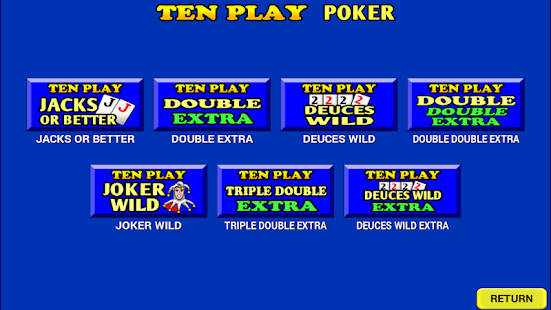 Ten hand multi-play video poker. Ten hands at once for ten times the action! Unlike slots machines, video poker allows the player to use skill to beat the house. Play this popular game just like in Vegas.