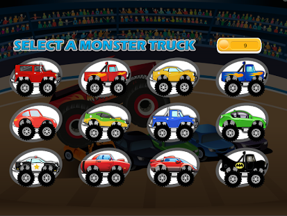 มี 12 รถบรรทุกมอนสเตอร์ให้เลือกรวมทั้งรถบรรทุกมอนสเตอร์ค้างคาวคือได้รับเหรียญในเกมที่จะได้รับรถบรรทุกใหม่โดยการทำงานมากกว่ารถยนต์ และ 10 ระดับของการกระโดดปีนขึ้นเนินเขาสนุกในเด็กและเด็กวัยหัดเดินนี้เกมแข่งรถ