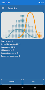 You can see statistics by choosing the menu item in the Main Menu. Information includes the overall score, overall time, accuracy, count of correct and incorrect answers.