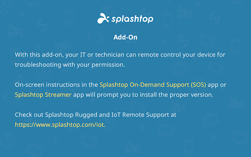 This add-on enables remote control of a Samsung device through the Splashtop SOS app or Splashtop Streamer app by a technician using Splashtop Rugged & IoT Remote Support with proper commercial license required.