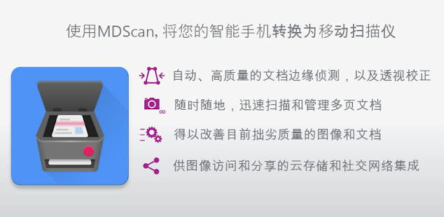 MDScan is a mobile doc scanner that allows you to scan any type of document using your phone camera. This could be receipts, text pages, coupons, posters, magazine articles, invoices, pictures, and any printed documents.