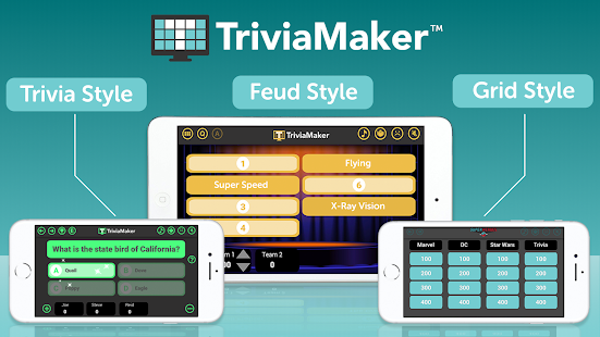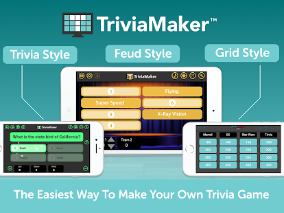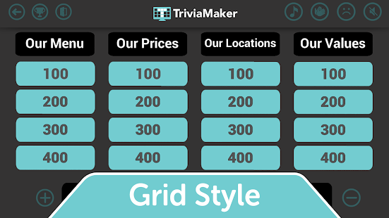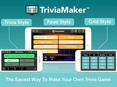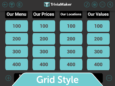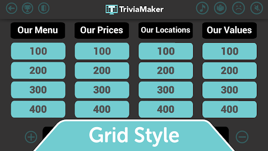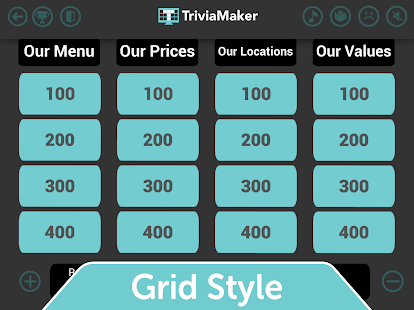 Trivia Maker is an exciting "build your own quiz / gameshow" app. The layout of the board is a lot like the game Jeopardy, Family Feud, Who Wants to be a Millionaire, or other trivia game shows.