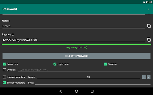 Password Master is open source app for generating, managing and storing passwords in a secure encrypted database. Generate secure passwords using cryptographically secure pseudo-random number generator. You are given options to choose which characters your password should contain or you can choose your set of a custom symbols. Generating, managing and storing passwords with Password Master is fast and easy, just check options and hit a button to generate password and store it in an encrypted database.