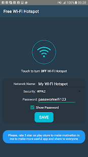 แอปพลิเคชั่น Wifi Hotspot พร้อมที่เก็บข้อมูลน้ำหนักเบาสามารถออกอากาศ wifi แชร์ wifi จากโทรศัพท์ของคุณได้อย่างรวดเร็วปลอดภัยและเรียบง่าย