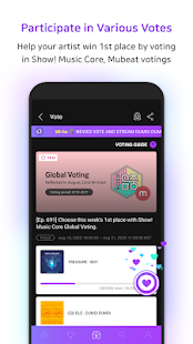 Fans all over the world can now participate in voting for not only the 1st place winner of Korean music show programs like Show! Music Core etc, but also vote on various contents in Mubeat Voting and vote to win the benefit of THE SHOW TV spot ad!