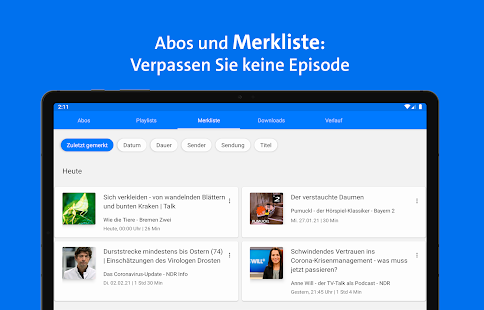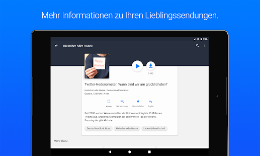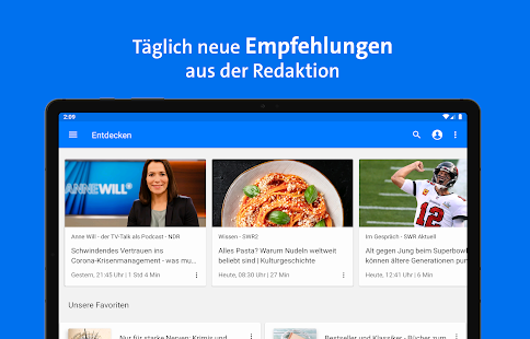 Stöbern Sie in den Rubriken oder nutzen Sie die Suche, um genau die Inhalte zu finden, die Sie interessieren. Sie können Sendungen abonnieren, Audios vormerken und eigene Playlists erstellen. Über den ARD-Login können Sie diese Inhalte in Ihrem Konto speichern und so auch geräteübergreifend nutzen. Lassen Sie sich von Empfehlungen inspirieren und teilen Sie über die Sharing-Funktion mit Freunden, was Sie begeistert!