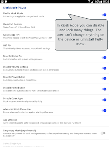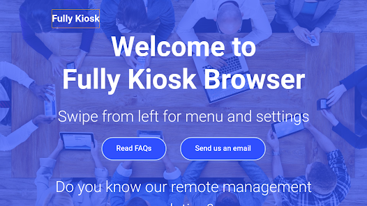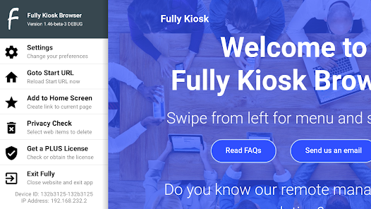 Fully Kiosk เป็นเบราว์เซอร์ Android Kiosk ที่กำหนดค่าได้และตัวเรียกใช้แอป ล็อกและจำกัดเว็บไซต์ของคุณและล็อกแอปอื่นๆ ในโหมดคีออสก์ เบราว์เซอร์คีออสก์เต็มรูปแบบมีโหมดคีออสก์แบบเต็มหน้าจอ การตรวจจับการเคลื่อนไหว ผู้ดูแลระบบระยะไกลและคุณสมบัติอื่น ๆ อีกมากมายสำหรับป้ายดิจิตอล ระบบคีออสก์แบบโต้ตอบ แผงข้อมูล ตู้วิดีโอ และอุปกรณ์ Android แบบไม่ต้องใส่ข้อมูลใดๆ