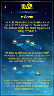 The rules are very simple. You can spawn a blob into an adjacent space or you can jump into a an open space one square away. Select a blob on your team by tapping on it. One selected, your blob will be highlighted and the possible moves you may take will be shown with darkened and lighted blue tiles. Tap on a highlighted tile to complete your move.