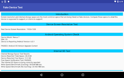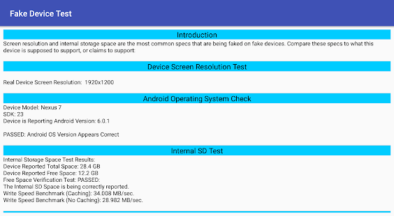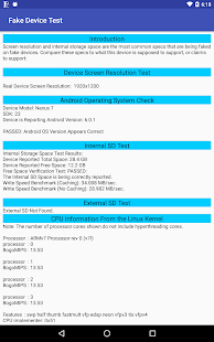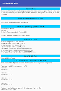 This app detects fake devices that have modified firmware which conceals the real/actual hardware specifications of the device. Other device testing apps will usually fail to report the true specifications on faked devices because they only report what the operating system tells them, which is fake specifications. This may be the only app on the play store that will report true device specifications because we do not rely on what the operating system is reporting, we find the true specs by running tests.