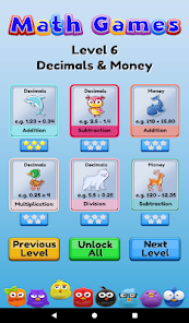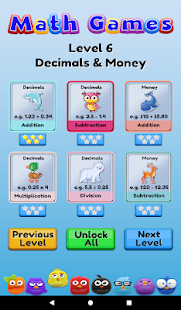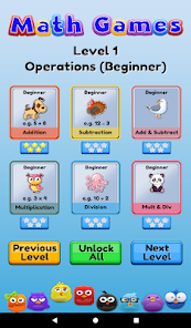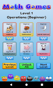 การบวกการลบการคูณการหารตัวเลขเชิงลบเศษส่วนเลขทศนิยมเงินเลขชี้กำลังรากที่สองการแปลงการเปรียบเทียบเปอร์เซ็นต์การปัดเศษเศษเหลือแฟกเตอร์การแปลงไบนารีการคำนวณอายุและการดำเนินการทางคณิตศาสตร์ เพิ่มลบคูณและหารทั้งหมดมาในระดับความยากระดับเริ่มต้นระดับกลางและระดับสูงตลอดจนเติมเต็มความท้าทายที่ว่างเปล่า โดยทั่วไปแนวคิดทางคณิตศาสตร์เหล่านี้ครอบคลุมในชั้นอนุบาล 1 ประถมศึกษาปีที่ 2 ชั้นประถมศึกษาปีที่ 3 ชั้นประถมศึกษาปีที่ 4 ชั้นประถมศึกษาปีที่ 5 ชั้นประถมศึกษาปีที่ 7 และชั้น 8