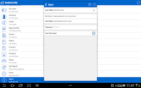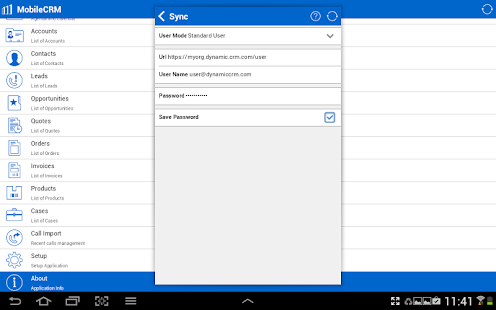 IMPORTANT: With Resco Mobile CRM, log into your MS Dynamics CRM server (On-Premise or Online), Oracle CX, or Salesforce. You can also log into the Resco CRM server that serves as a Standalone CRM Solution or as middleware between your backend and the mobile client. Without the access to your CRM organization, you will be only able to work with the demo database.